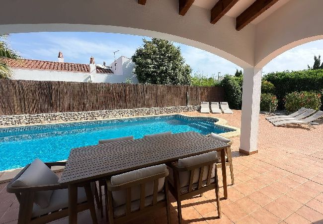 The house in Es Castell has 3 bedrooms and has capacity for 6 people. The house is 105 m². The accommodation is equipped with the following items: garden, garden furniture, fenced garden, terrace, washing machine, dryer, barbecue, iron, internet (Wi-Fi), hair dryer, air conditioning throughout the house, private swimming pool, open-air parking, 1 TV.In the induction kitchen, refrigerator, microwave, oven, freezer, dishwasher, dishes/cutlery, kitchen utensils, coffee machine, toaster and kettle are provided.