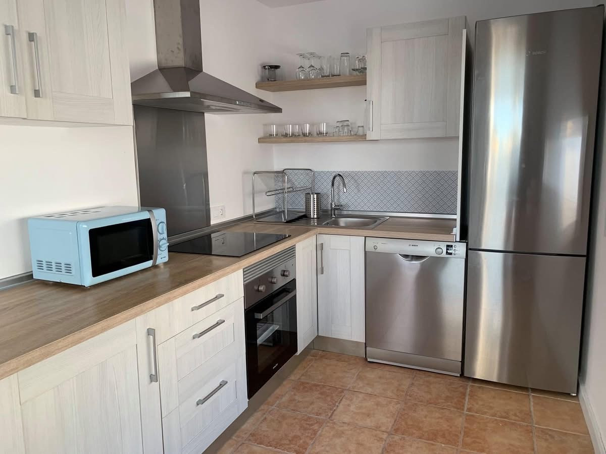 La cuisine, à induction, est équipée avec réfrigérateur, micro-ondes, four, congélateur, lave-vaisselle, vaisselle/couverts, ustensiles/cuisine, cafetière, grille pain et bouilloire.